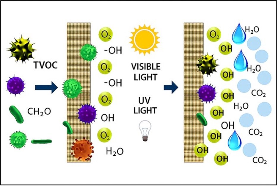 Traditional photocatalytic solutions offered in the market requires the presence of UV light. When applied to the interior surfaces of wardrobes and cabinets, it does not effectively catalyse the decomposition of formaldehyde and VOC due to lack of activation energy.